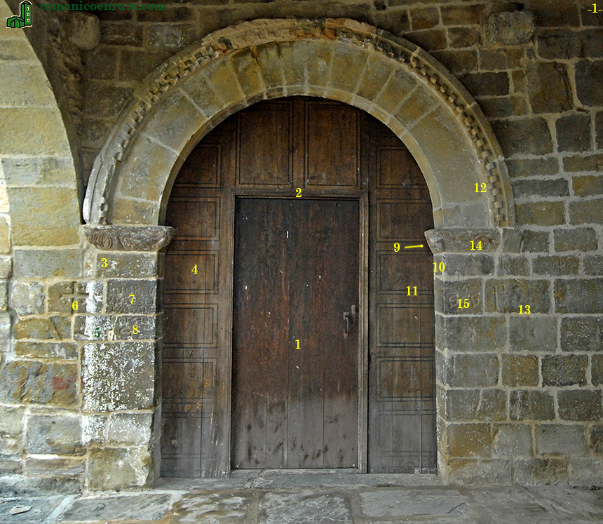 La única portada de la iglesia se abre en el muro sur (foto 1) y, como veis en la instantánea, es de composición muy simple (enlace 1). El arco de medio punto lo forman dovelas de diferente tamaño (enlace 2) aunque bien escuadradas y viene enmarcado por guardapolvos de billetes algo deteriorado en su parte central (enlace 12). Apea directamente sobre dos ménsulas que, a su vez, apoyan sobre las jambas.