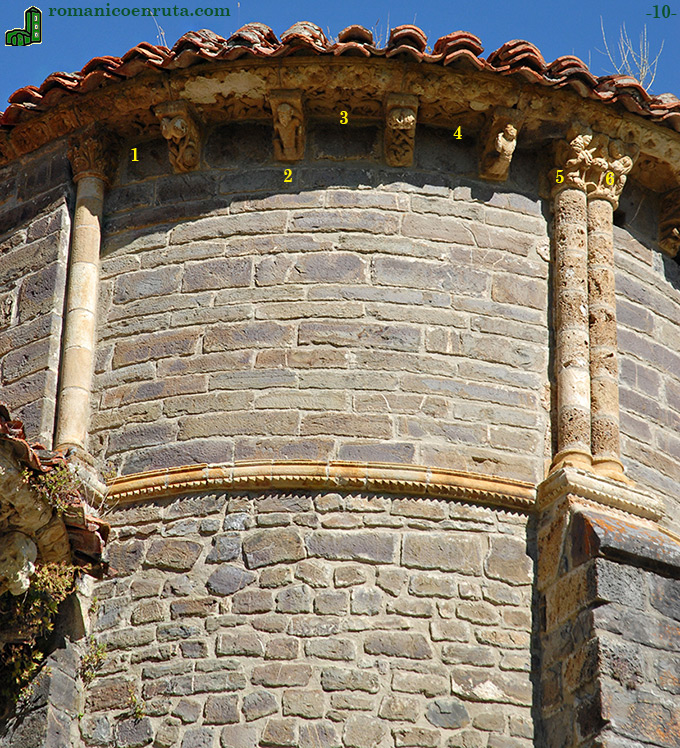 El ábside central es el que más cambios sufrió con la reforma de Covaterio. Dos contrafuertes prismáticos lo dividen en tres calles que, por su parte, son divididas en tres cuerpos mediante impostas. De la imposta superior salen semicolumnas de un fuste en los extremos y doble fuste en el centro que terminan en capiteles sobre los que descansa la magníficamente decorada cornisa. Una serie de once canecillos (cuatro en la calle izquierda, tres en la central y otros cuatro en la derecha) se añade a aquéllos para sostenerla.