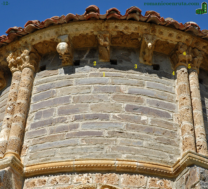 La calle central destaca por la ventana abierta en su cuerpo medio que describiremos más adelante. En cuanto a la cornisa (foto 12), son tres los canecillos que la sostienen además de los capiteles de las columnas de doble fuste. Las metopas también se decoran con diferentes motivos vegetales. El canecillo 5 (enlace 1) representa a una grulla que pica a una serpiente o culebra que se enrosca a su largo cuello. En el 6 (enlace 2) observamos un ser fantástico con cabeza de mujer y cuerpo de ave. Un ciervo de cuerpo entero con generosa cornamenta (enlace 3 y foto 13) ocupa el caveto del siguiente canecillo.
