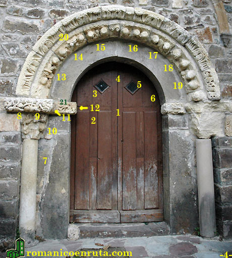 En todo caso, la del izquierdo es obra de gran pericia. Se divide en cuatro escenas, que de izquierda a derecha son : 1- caza del jabalí y entrelazo (enlaces 7/8/9); 2- dos grifos afrontados que sujetan racimos (enlaces 2/11); 3- dos animales fabulosos afrontados que muerden tallos (enlace 21); 4- en la jamba izquierda de la puerta: arquero que hace frente a un basilisco o grifo (enlace 12).