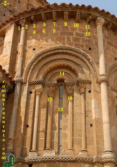 El ábside central (fotos 2/3) es algo más elevado que los laterales y también más ancho. Todas las calles tienen amplias ventanas, pero la de la calle central ya no es la románica original sino una reconstrucción. Al parecer, en 1682, Francisco del Pontón abrió toda la calle para construir una sacristía que, en años posteriores, fue derruida para devolverle al ábside su unidad. Todas las ventanas llevan chambrana de billetes y tres arquivoltas, las dos interiores apoyando sobre capiteles que, a su vez, son sostenidos por columnas monolíticas. La ventana de la calle izquierda (foto 3, enlaces 13/14) es la que mejor se ha conservado. De sus cuatro capiteles sobresalen los dos interiores: el izquierdo (enlace 15) lleva en la cesta una especie de malla con rosetas interiores y en la parte superior pequeñas cabezas animales entre volutas; el derecho (enlace 16) una figura humana con bastón en su parte izquierda, un águila que picotea a su presa en la esquina y otra figura humana en el lado derecho que parece tenérselas con un monstruo.