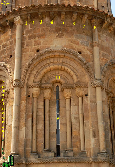El ventanal de la calle central (foto 3, enlaces 9/10) se reconstruyó por completo en época moderna. La que sí mantiene todos sus elementos originales es la serie de canecillos y capiteles que sostiene la cornisa y que de izquierda a derecha son: can 7- figura simiesca que se lleva la mano al mentón (enlaces 1/2); 8- bola con caperuza (enlace 3); 9- pareja abrazándose (4); 10- águila con su presa (5); 11- monstruo que engulle a una probable figura humana invertida de la que sólo vemos la cara (enlace 6); 12- monstruo con las fauces abiertas (7); capitel 3- entrelazo (enlace 8).