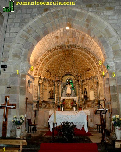 El acceso a la cabecera se realiza a través de un arco triunfal de doble rosca ligeramente apuntado (foto 4). La rosca interior descansa sobre semicolumnas con capiteles esculpidos. El capitel izquierdo lleva representado en la parte central de su cesta un Pantocrátor (enlace 2) que bendice con su mano derecha en alto y sostiene un gran libro herrado en su mano izquierda. Los cuatro símbolos de los evangelistas sostienen la mandorla. En los laterales de la cesta, los doce apóstoles, seis a cada lado (enlace 1), acompañan la escena.