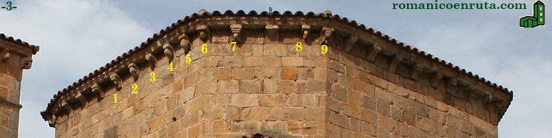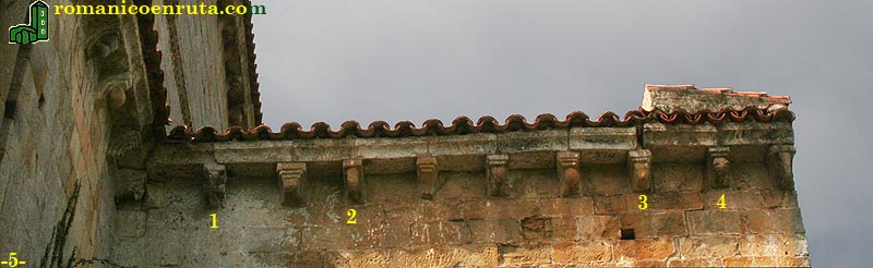 En el lado norte del transepto (foto 5) se repiten los motivos decorativos de los canecillos, con alguna variación: