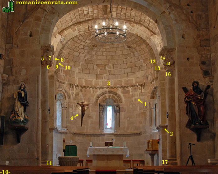 El arco de triunfo (foto 9) es de medio punto, doblado y algo rebajado. Apoya sobre columnas entregas con capiteles historiados y basas de tipo ático (enlaces 11/17) que descansan sobre alto plinto. Éste, a su vez, apea sobre banco que recorre tanto presbiterio como ábside.