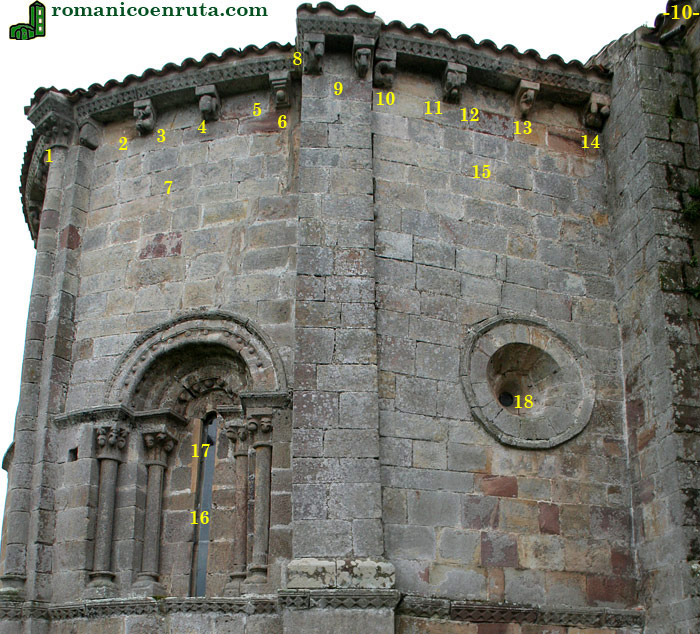 En el lado norte del presbiterio (enlace 15), la cornisa se sostiene por otros cuatro canecillos: animal monstruoso de largo cuello (enlace 10); dos personajes de grandes cabezas, uno con la boca abierta, sosteniendo sendas lanzas, y una cabeza en la parte inferior de la cesta (enlaces 11/12); personaje monstruoso sentado (13); dos figuras humanas, bastante deterioradas (enlace 14). Un gran óculo, al parecer de época posterior, se abre a media altura del muro (enlace 18).