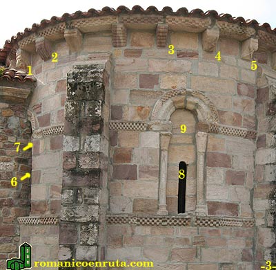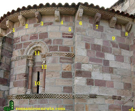 La ventana de la izquierda ha quedado bastante oculta debido a la construcción de la sacristía en el muro sur (foto 3). La cornisa del ábside esta decorada con tres filas de tacos y la sostienen canecillos figurados. Empezando por el lado sureste podemos detallar los siguientes: cabeza de bovino con un rollo entre sus dientes (enlace 1); cinco peces en posición vertical alternando cabeza y cola (enlace 2); cinco rollos horizontales en caveto (enlace 3); personaje de perfil con un gran instrumento musical (enlace 4); aspa con botón central y extremos ensanchados (5).