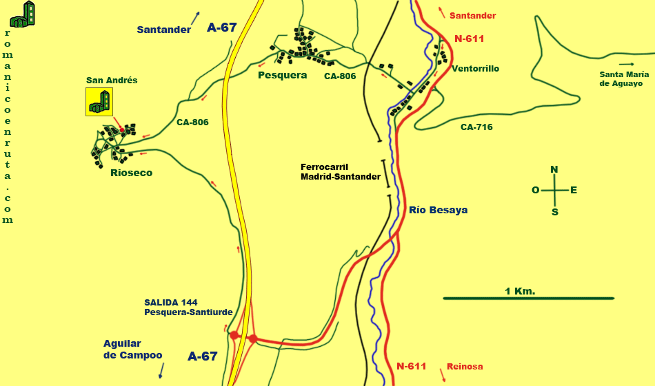 El mapa de la ruta 4 incluye en su parte inferior el enlace de San Andrés de Rioseco, iglesia que visitamos en esta ruta a pesar de que para llegar hasta ella, como sucede en el caso de Cotillo, tengamos que abandonar el valle del Besaya. Cuando salgamos de Bárcena Pie de Concha y nos incorporemos a la N-611 tomaremos dirección sur hacia Reinosa. Unos pocos quilómetros después, a nuestra derecha, saldrá el desvío que, por Pesquera, conduce hasta Rioseco. Se trata de una carretera local no muy ancha que pasa primero por debajo de la línea de ferrocarril Santander-Madrid y luego por debajo de la autovía Cantábrico-Meseta. Cuando lleguemos al pueblo, la iglesia se encuentra a nuestra derecha, en la parte alta. La llave la tienen en una de las casas vecinas, la anterior al templo a mano izquierda. Si, por el contrario, os acercáis desde la A-67 ya sea en sentido norte o sur, podéis tomar la salida 144 de Pesquera-Santiurde y, sin pasar por Pesquera, acceder directamente al núcleo urbano de Rioseco. |