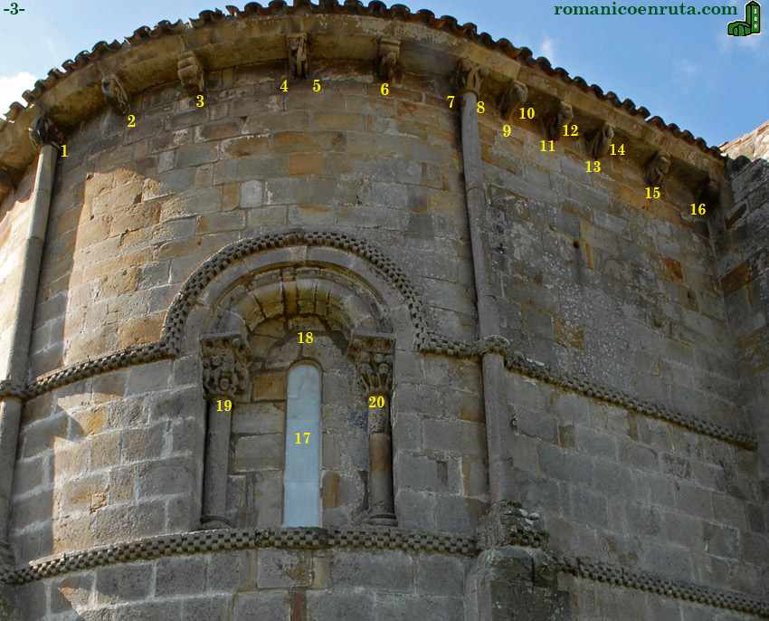 Los canecillos que sostienen la cornisa del tramo norte, incluido el capitel de la semicolumna, son: capitel 4, tres pares de volutas que se entrecruzan (enlace 8); prótomo de carnero (9/10); perro o lobo que vuelve la cabeza hacia su izquierda (11/12); un cerdo (13/14); hombre que se apoya en un bastón en T (15); otro cerdo (16).