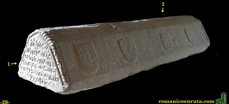 También de época románica es la tapa de sarcófago (foto 20) que hoy en día encontramos en el interior del templo. En su testero (enlace 1) una inscripción reza: !Aqui yase Iohan Sanches de Bustamante/ fino XI dias de Febrero año de mil cuatrocientos noventa y dos años! según transcripción del escritor Amós de Escalante (1871).