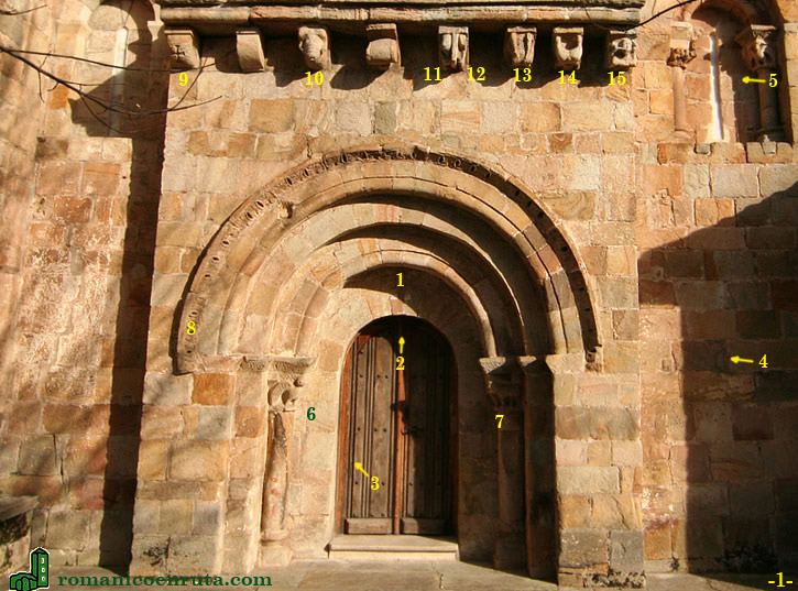 Se compone de arco de medio punto y tres arquivoltas (foto 2, enlaces 1/2). La interior es baquetonada y apoya en dos capiteles: el de la izquierda (enlace 6) se decora con un águila que despliega las alas y el de la derecha (enlace 7) con animales afrontados. El guardapolvos (enlace 8) es de ovoides secantes en los que se inscriben hojas.