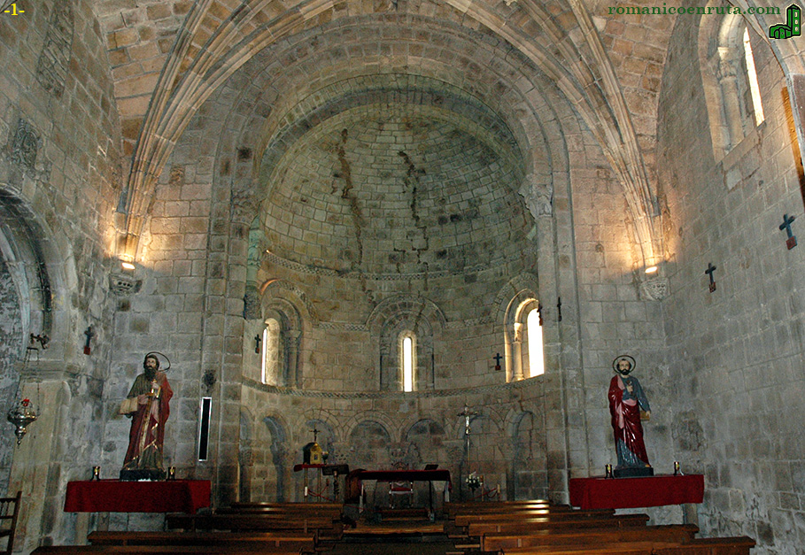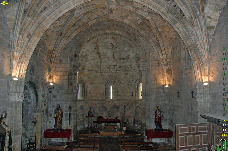 El interior del templo sólo conserva del original románico la cabecera (fotos 1 a 4), es decir, el ábside, presbiterio y arco triunfal. También son románicos los dos muros de la nave, pero no la cubierta de la misma, reformada en época gótica.