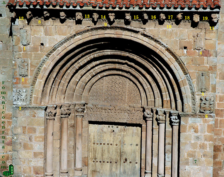 La cornisa sobre la puerta principal (foto 2) se sostiene sobre trece canecillos, a saber: un saltimbanqui, un arpista, figura que se lleva las manos a la cabeza (algo deteriorada), figura sedente con cabeza de monstruo (enlaces 8/12); escena de coito muy parecida a la del ábside, cabeza de cabra, figura antropomórfica que sostiene una barra con sus manos y figura demoníaca que engulle una figura humana (enlace 9); figura sedente con rostro simiesco, figura que lleva su mano derecha a la boca, figura fálica torciendo el gesto y figuras impúdicas (enlace 10); por último, animales superpuestos (enlace 11).