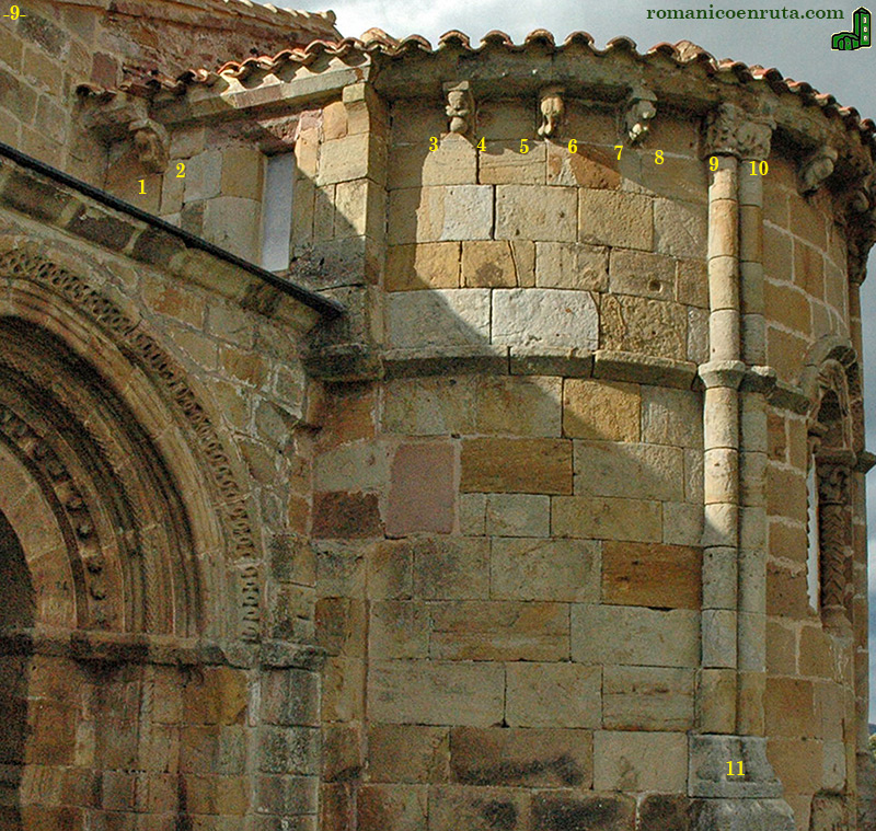 La cornisa del ábside (foto 9) se sustenta sobre una serie de canecillos de variada ornamentación. En el tramo recto del presbiterio sur sólo se conserva uno, en que observamos (enlaces 1/2) a una mujer sentada que guarda algo en el regazo. Los otros canecillos de este tramo se perdieron al abrirse en época muy posterior la ventana que hoy podemos observar.