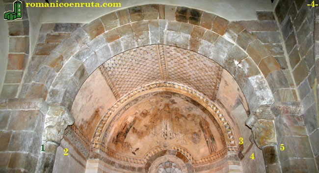 Quedándonos, entonces, con las dudas de si una tercera nave meridional románica fue añadida al final de las obras, lo que el interior de Santa María nos ofrece se circunscribe a la nave central y a la del evangelio. El arco de triunfo (foto 4) descansa sobre dos capiteles: el de la izquierda (enlaces 1/2) decora el cimacio con flores cuatripétalas y en la cesta lleva el tema de la lucha de caballeros entre los que se interpone una mediadora; el cimacio del capitel derecho se orna con entrelazo y en la cesta dos grifos, a los que muerden sendas serpientes, parecen iniciar una lucha (enlaces 3/4/5). Los restos de pintura que podéis observar al fondo son de época posterior.