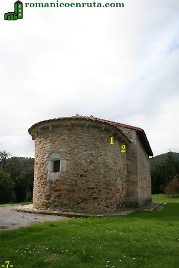 La cabecera (foto 5) consta de presbiterio recto y ábside semicircular. Lo que distingue a San Román de otras pequeñas iglesias de concejo es que el presbiterio se une al ábside sin solución de continuidad, cuando lo normal es que algún elemento estructural, un contrafuerte por ejemplo, los separe.