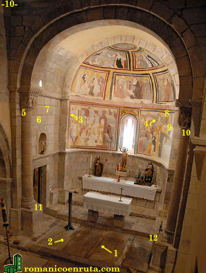 El arco triunfal (foto 10) que da acceso al presbiterio es de medio punto y descansa sobre capiteles esculpidos. El capitel izquierdo, cuyo cimacio es de billetes, lleva en el centro de la cesta una figura humana (enlace 6) que parece levantar en alto el brazo izquierdo de otra figura (enlace 5) que está luchando con una fiera, ocupando éstos el lado izquierdo de la cesta. Sobre la fiera, otro pequeño personaje parece llevar un bastón. En el lado derecho de la cesta (enlace 7), un centauro dispara su arco. Todas las figuras son de ejecución algo torpe.