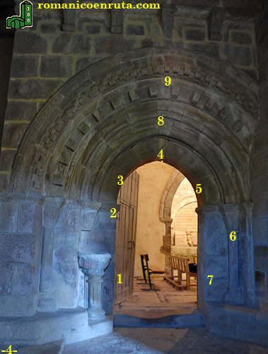 La componen cuatro arquivoltas (foto 4, enlace 8) y una chambrana decorada con rombos tangentes (enlace 9). A este guardapolvos le sigue una arquivolta con doble fila de billetes. La siguiente lleva una serie de 14 prismas, mientras que las dos más interiores se decoran, respectivamente, con doble baquetón y grueso bocel con escocia (enlace 5).
