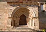 La componen cuatro arquivoltas (foto 4, enlaces 1/6/7) que descansan sobre capiteles y columnas. La chambrana ha sido remodelada por completo. La arquivolta exterior es lisa, la siguiente de baquetón entre escocias; les sigue una tercera decorada con grandes dientes de lobo mientras que la arquivolta interior vuelve a ser de baquetón entre escocias. Los arcos presentan un ligero apuntamiento. Tanto a la izquierda como a la derecha, las jambas sobre las que descansa el arco interior se decoran con amplias impostas en que se repiten los motivos vegetales con los que se decoran los capiteles (enlace 8).