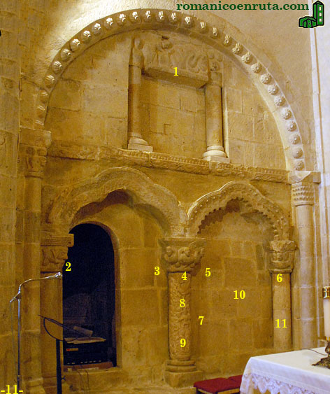 La arquería inferior apoya sobre capiteles excelentemente esculpidos. El de la izquierda (enlace 2) con una cabeza masculina; el central con tres arpías (enlaces 3/4/5) y el derecho (enlace 6) con tres personajes dentro de una barca. Los fustes de las columnas (enlaces 7 a 9 y 11) también están muy trabajados. El de la columna central se decora con aves, motivos vegetales y una pareja acosada por serpientes, y el de la derecha con hojas verticales dispuestas a modo de escamas. En el tramo sur nos encontraremos con una disposición casi simétrica de los mismos elementos, pero allí los arcos de la arquería inferior son de medio punto. |