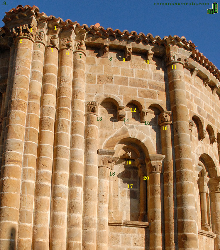En la cornisa de la calle absidial sur (foto 9) destacamos, en primer lugar, los capiteles de las columnas (enlace 1): el caballero victorioso (enlaces 2/3); un rostro (enlace 4); una cabeza de animal (5); voluta en la esquina y forma poco clara (6) y un animal engullendo un personaje (7). A éstos siguen tres canes: bola con caperuza (8); ¿flor cuatripétala con botón central? (9); dextera domini (10). Por último, el capitel de la semicolumna, decorado con volutas y bolas con caperuza (11).