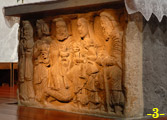 En las tres primeras fotografías os ofrecemos tres vistas del frontal de altar y su actual ubicación, donde ha recuperado las funciones para las cuales fue esculpido. En él se representa una Epifanía en la que los tres reyes se colocan a la izquierda y la Sagrada Familia a la derecha.