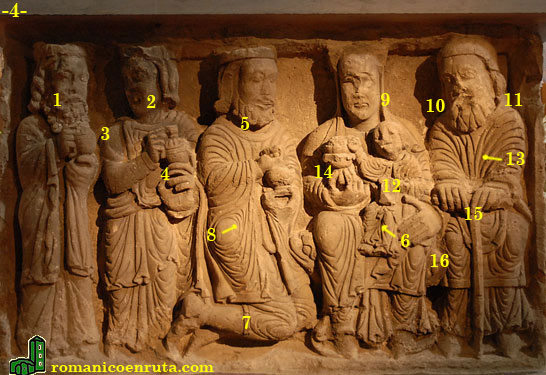 Como sucede en el frontal de Butrera, los dos reyes de la izquierda (foto 4, enlaces 1 a 3) al parecer en conversación, están de pie, llevan corona y portan en sus manos las ofrendas (enlace 4). El tercer rey (enlaces 5/6/7), arrodillándose ante la Virgen, abre el recipiente en que porta la ofrenda.