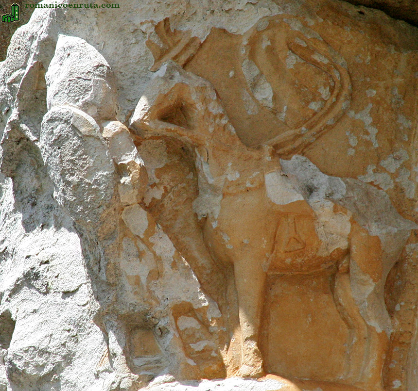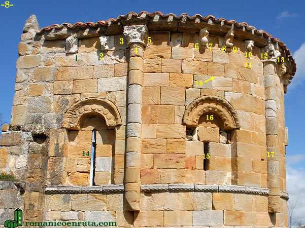Una imposta abilletada recorre la cabecera en su totalidad dividiéndola en dos cuerpos. El superior es el que alberga las ventanas, que arrancan directamente de aquélla. El estado de conservación no es el óptimo y tanto canecillos como capiteles han perdido, en algunos casos, las figuras en ellos esculpidas. En el tramo presbiterial sur (foto 8), dos canes muy deteriorados muestran un ave de rapiña (quizá un águila) (enlace 1) y motivos vegetales (enlace 2). Junto a este último se encuentra el capitel de la semicolumna en que se representó la que debía de ser una escena de lucha (enlaces 3 a 5): a la derecha de la cesta (enlace 5 y foto inferior) observamos un caballero de pie con escudo, casco y lanza que parece acometer a una figura central hoy desaparecida que quizá fuese un animal (4). A la izquierda de la cesta (3) se colocó otro cuadrúpedo. La ventana presbiterial (enlace 14) ha perdido los capiteles y columnas. Su arco se adorna con bezantes y chambrana lisa (enlace 14).