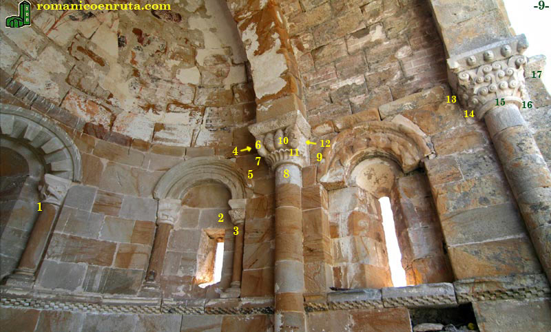 Pasemos a la mitad meridional, la de la foto inferior. A la derecha observamos el capitel sur del arco triunfal, en el centro el capitel del arco fajón, y a su izquierda los ventanales del ábside.