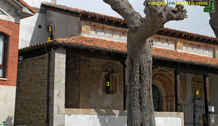 Mucho más fáciles de ver al detalle, las ventanas del muro sur (enlaces 3/4) se colocan a ambos lados del cuerpo resaltado que alberga la portada y se abren, respectivamente, en el primer y tercer tramo de la nave. La ventana del tramo oeste (foto 8) consta de arco decorado con dos pares de aves que entrelazan sus cuellos en los extremos y un prótomo de bóvido en la clave. En el tímpano (enlace 2) se esculpe un caballero sobre su montura. El capitel izquierdo lleva hojas verticales terminadas en volutas (enlace 3) y el derecho una cabeza de animal, quizá la de un perro o lobo (4).