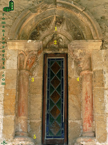 Con el añadido de la nueva torre, el hastial occidental queda casi oculto, con lo que resulta difícil observar lo que se conserva de una ventana románica colocada por encima de la portada (foto 7, enlaces 1/2). Si la queréis ver tenéis que cruzar la carretera y alejaros del templo o subiros al pretil que cierra el patio de entrada. El capitel izquierdo (enlace 2) se orna con hojas de palma en posición vertical. El arco (enlace 1) se decora con puntas de diamante y chambrana de pequeñas hojas a las que envuelve un zarcillo.