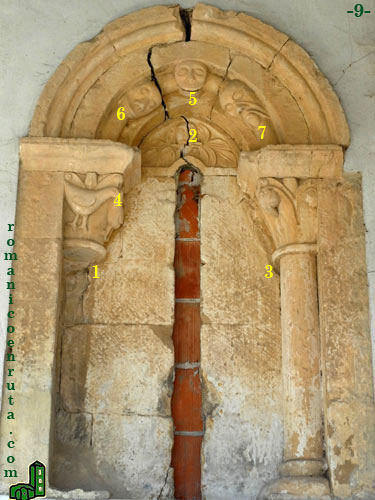 La ventana oriental (foto 9) es parecida morfológicamnete a la anterior, pero en el arco (enlace 2) observamos tres máscaras o cabezas de monstruo (enlaces 5 a 7), una de las cuales, la izquierda, engulle el bocel (enlace 6); y en el tímpano otra cabeza de monstruo de la que salen haces de hojas. Los capiteles de las columnillas, la izquierda desaparecida, llenan las cestas con aves afrontadas (enlace 4) y hojas verticales terminadas en bayas (enlace 3).