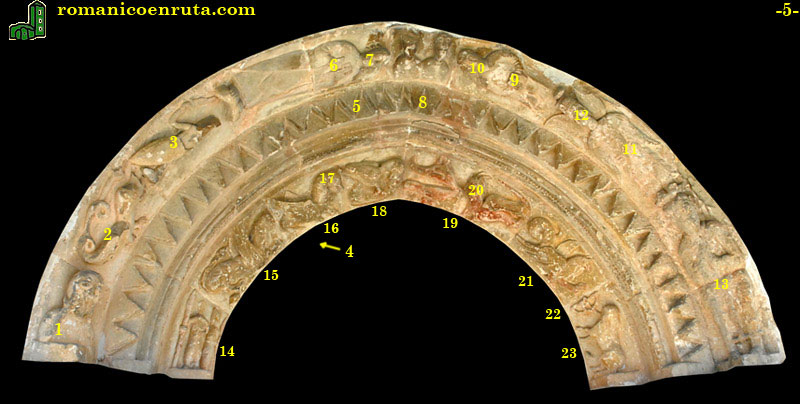 Las arquivoltas (foto 5) son tres, dos de las cuales, la exterior y la interior, presentan motivos figurados, mientras que la central es recorrida por un fino bocel y una banda de dientes de sierra.