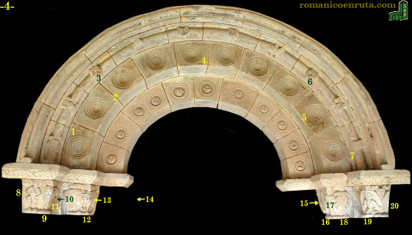 Empezaremos la descripción por las arquivoltas. La exterior es un grueso bocel al que parecen sostener un par de cordones en entrelazo (enlace 1), cabezas de felino que muerden el baquetón (enlaces 3/6) y algunas manos (enlace 7). La arquivolta interior es un poco más ancha y está formada por diez dovelas ornadas con círculos concéntricos en degradación (enlaces 2/4/5).