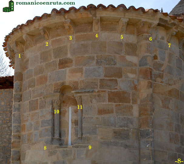 Pasemos a la calle central (foto 8). En el enlace 1 os mostramos el lateral derecho del capitel de la semicolumna, descrito en la página anterior. Los canecillos que sostienen la cornisa llevan esculpidos los siguientes motivos: un pequeño rostro humano (enlace 2); lo que probablemente sea una máscara (enlace 3); otra pequeña cabeza humana (4) y dos bolas con caperuza (5). A continuación viene el capitel de la otra columna entrega, de decoración muy parecida al de la semicolumna anterior salvo por el detalle de la incorporación de una pequeña cabeza humana en la cara central (enlace 6). En la calle norte se colocaron dos canecillos de bola con caperuza (enlace 7).