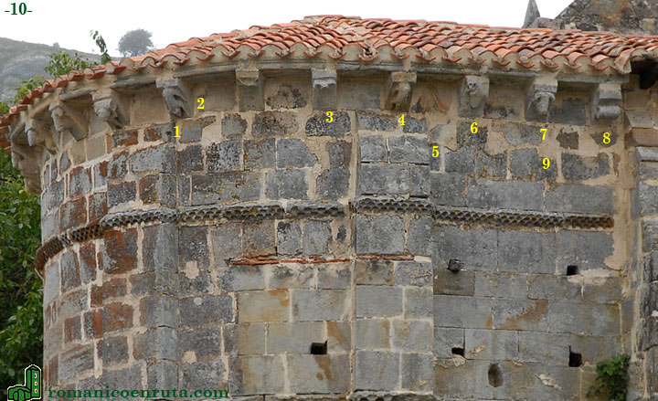 Pasemos al lado norte de la cabecera (foto 10). A la derecha del estribo el cantero esculpió un cuadrúpedo que se agacha, tal vez un perro (enlaces 1/2). Dos canes más sustentan la cornisa del paño norte del semicírculo, pero solo el del extremo derecho permite sugerir que la figura en él trabajada se trataba de un carnero (enlace 3). Sobre el estribo que marca la transición entre ábside y presbiterio (enlace 4) el can lleva una liebre o conejo, tema ya visto en el paño meridional.