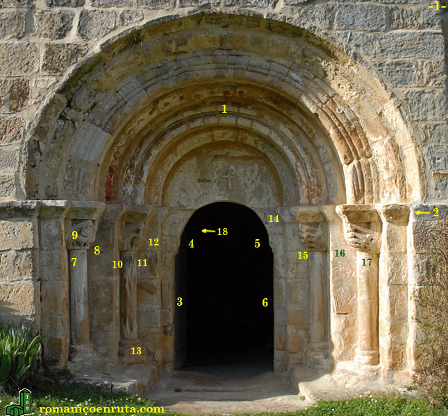 El único acceso al interior del templo se abre en la fachada meridional, en cuerpo adelantado al mismo (foto 1). Consta de arco de medio punto, dos arquivoltas que apean sobre columnas acodilladas y tres cenefas que descansan directamente sobre las jambas (enlaces 1/2/18). Todas las columnas son de fuste liso y se rematan con capiteles figurados cuyos motivos se repiten mucho tanto en el románico del norte de Burgos como en el de Cantabria (Molledo, Bolmir).