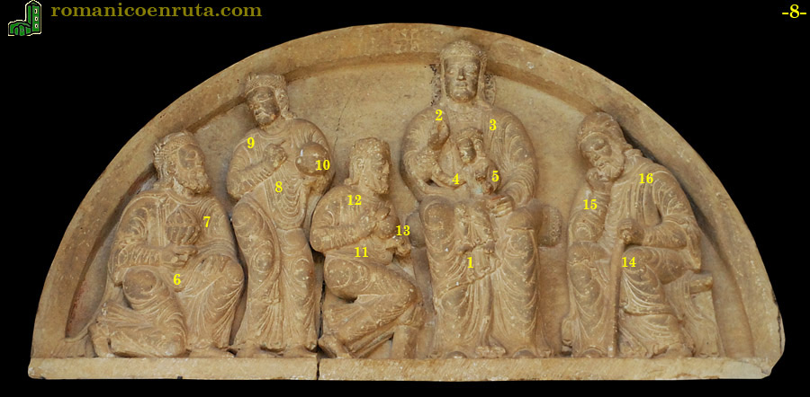 Tanto en los frontales como en el tímpano, los tres reyes llevan la ofrenda en las manos y el más próximo a la Virgen (enlaces 11/12/13) está arrodillado. En los tres casos, el segundo rey (enlaces 8/9/10) permanece de pie girando su rostro hacia el tercero que, en Butrera y Villasana también está de pie, mientras que aquí, por la pérdida de espacio, se arrodilla como el primero (enlaces 6/7).