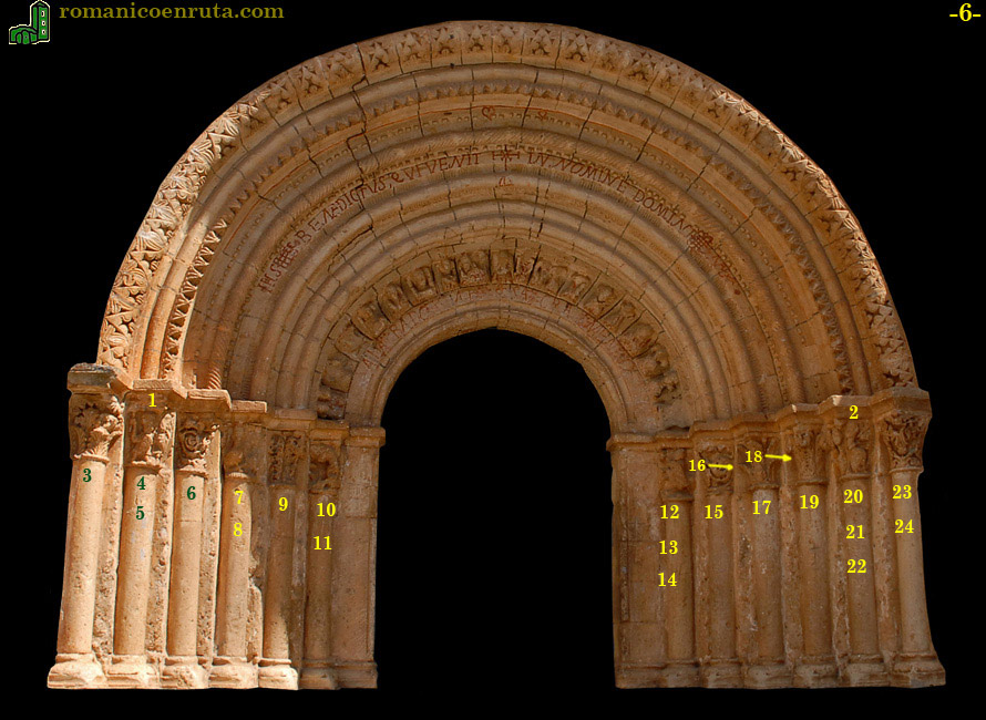Las capiteles de las columnas (foto 6) esculpen motivos vegetales del estilo de los de Aguilar de Campoo y Las Huelgas, y algunos figurativos. En los del lado izquierdo de la portada (enlace 1) encontramos la siguiente decoración: el capitel exterior está formado por tres grupos de hojas de acanto (3); el que sigue lleva dos infantes luchando con cota de malla y escudo, el de la izquierda sostiene una maza en su mano derecha (4/5); el tercero muestra dos tallos en espiral que se entrelazan (enlace 6); el siguiente contiene dos arpías afrontadas (enlaces 7/8); en el quinto se cincelan altas hojas de acanto y, por último, en el capitel más cercano a la entrada, dos animales sujetan a otro con sus patas y le muerden en el cuello y el lomo (enlaces 10/11).