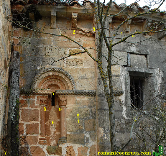 El capitel de la semicolumna que separa el tramo recto del presbiterio del ábside está decorado con grandes hojas cóncavas y nervadas que llevan atados en sus puntas pesados caulículos (enlace 3). En el semicírculo destacamos un canecillo con un personaje sentado con un libro sobre las rodillas en el que apoya la mano izquierda, mientras que su cabeza descansa sobre la mano derecha (enlaces 4/5). |