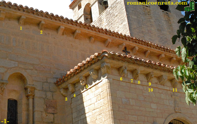 Bajo el alero del pórtico construido para proteger la portada, procedentes probablemente de la antigua cabecera, se reubicaron algunos de los canecillos originales. Su temática es algo más variada e incluye, entre otros, una figura de pie con ojos saltones (quizá un ave nocturna, enlace 3), un prótomo de perro o lobo (enlace 4), un ave de rapiña con un bidón en el cuello (enlace 5), un prótomo de cérvido (enlace 6), un músico (enlaces 7/8), un fiero animal con las fauces abiertas (enlaces 9/10), un busto humano (enlace 11)... |
