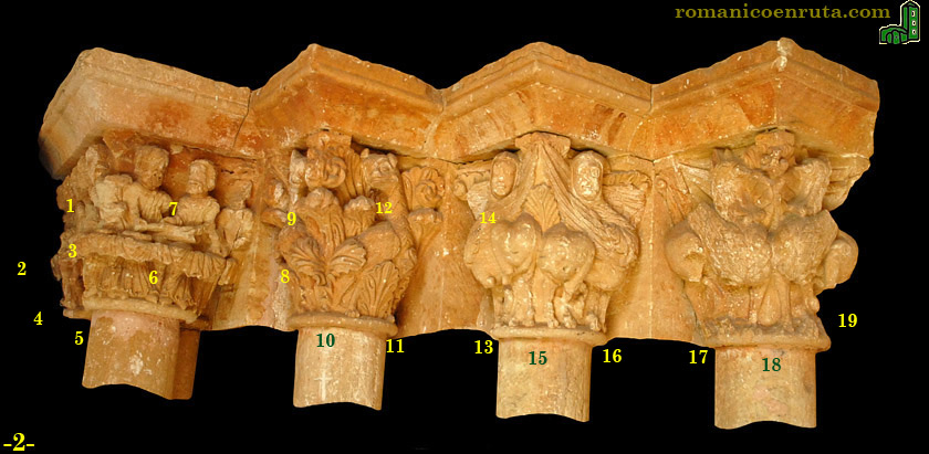 En la foto 2 os detallamos la decoración figurativa que contienen las cestas de los cuatro capiteles del lado izquierdo de la portada. Sobre las columnas pareadas de la parte externa, una Última Cena se dispone ocupando las dos cestas (enlace 5). Jesús está en el centro de la cara frontal, con nimbo cruciforme; a su diestra se aprecian tres apóstoles y otros dos a su izquierda. A los pies de Jesucristo, por delante de la mesa, se distingue una mano sobre una rodilla que corresponden a Judas arrodillado (enlaces 1/2/3); en el lado derecho del capitel se ubican otros cuatro apóstoles (enlaces 4/6/7), dos de ellos decapitados.