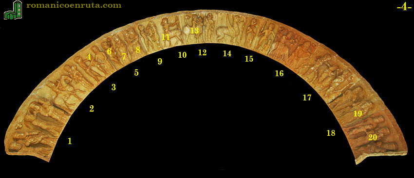 En la arquivolta exterior (foto 4) se ha representado la Matanza de los Inocentes de un modo muy particular. Las figuras que remiten directamente a la masacre ocupan la mayor parte del espacio (enlaces 1/2/3/4/9/15/18/19/20) pero entre ellas se intercalan otras que representan distintos episodios de la infancia de Cristo, como la Anunciación y la Visitación (enlaces 5/6/7/8) o la Huida a Egipto (enlace 16), y otros temas aparentemente fuera de lugar: un grifo (enlace 14), un centauro-sagitario (enlaces 10/11), Sansón desquijarando al león (enlaces 12/13), y un guerrero armado con espada luchando con un león rampante (enlace 17).