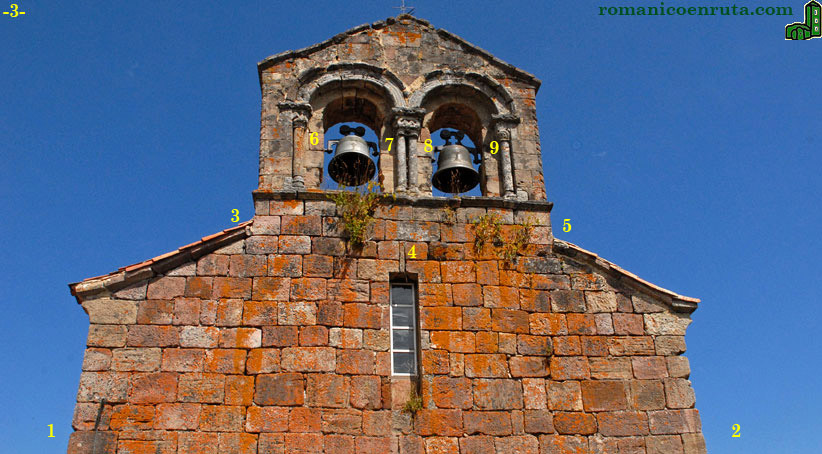 El acceso actual al interior de la iglesia se realiza por una puerta protegida por un porche moderno, quedando la portada original a la derecha del mismo. Os acercaréis a Santa Eulalia por la fachada de poniente, en la que se conserva una esbelta espadaña de doble vano (foto 3) con arcos de medio punto que apean sobre sendos pares de columnas, compartiendo las centrales un único capitel.