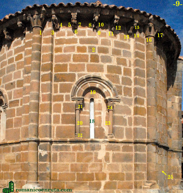 El siguiente can (enlaces 11/12) nos presenta a un personaje sentado cabeza abajo, que pone las manos sobre las rodillas; su vecino lleva una segunda liebre (enlaces 13 a 15). La ventana axial (enlace 18) es muy parecida a la ya descrita en la calle sur: un arco de medio punto compuesto de arquivolta y chambrana (enlace 19) apea sobre par de columnillas acodilladas (enlaces 20/23) con capiteles decorados con motivos vegetales (enlaces 21/24). Los cimacios de ambos capiteles son de caveto simple. |