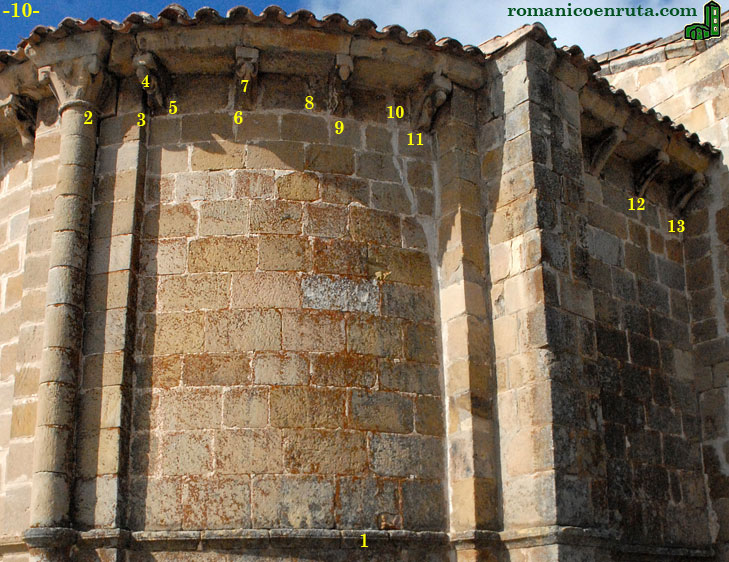 El lado norte de la cabecera (foto 10) es el menos elaborado y el único que carece de aberturas al exterior que, por la disposición de los sillares, parece que nunca fueron proyectadas. La transición entre la calle norte del semicírculo y el tramo del presbiterio se realiza por medio de un contrafuerte prismático, al igual que en el lado sur. El zócalo consta de tres hileras de sillares, los más erosionados del conjunto (enlace 1). En el enlace 2 os ofrecemos otra imagen del capitel de la semicolumna derecha. Observad la cabecilla humana en la parte superior central.
