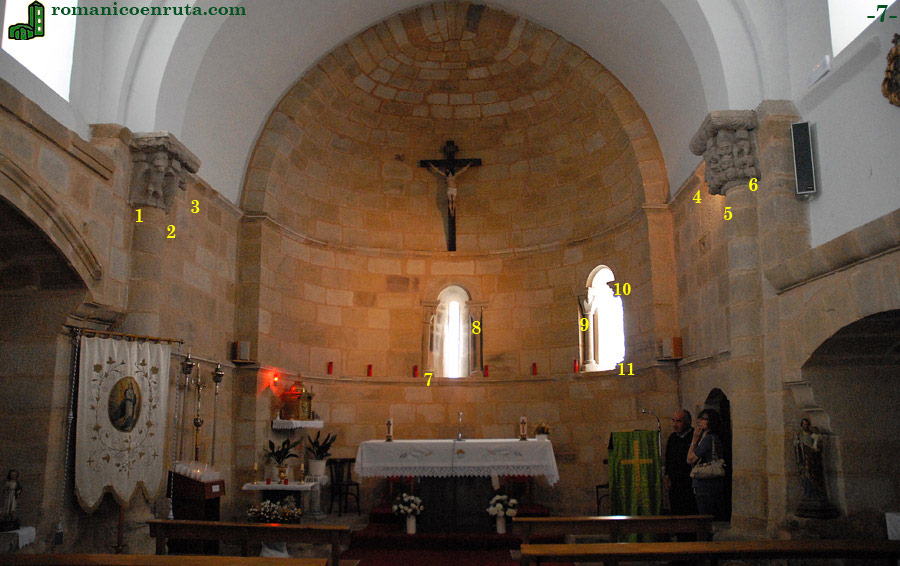 Las ventanas repiten la disposición ya vista en el exterior: un arco de medio punto descansa sobre dos pequeñas columnas acodilladas con capiteles de decoración vegetal muy sencilla. Algunos de éstos han sido restaurados. En el enlace 7 os ampliamos la basa de la columna izquierda de la ventana axial, mientras que en el enlace 8 el capitel de la columna derecha. Los enlaces 9 a 11 detallan los elementos de la ventana meridional. |