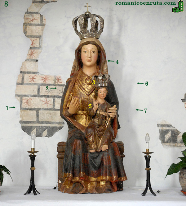 Para ser precisos en nuestra explicación os remitimos a lo que de la restauración de las imágenes se nos dice en la página de Románico Norte: "El proceso de restauración en la primera de ellas, la de la Virgen con el Niño, ha sido el más complicado técnicamente. Tras la realización de diversas catas, se pudo determinar la existencia, y buen estado de conservación, de las capas originales de policromía de la pieza, por lo que se decidió eliminar los repintes por considerarlo una solución estética más acorde con el valor histórico-artístico de la pieza. En una segunda fase tanto esta imagen de la Virgen con el niño como la de San Roque fueron sometidas a un proceso de estucado para reparar las faltas que aparecieron en la base de preparación de las piezas, paso previo e imprescindible para luego proceder a la reintegración cromática de las mismas. Cómo última fase, a ambas piezas se les aplicó una capa de protección tipo Paraloid ". |