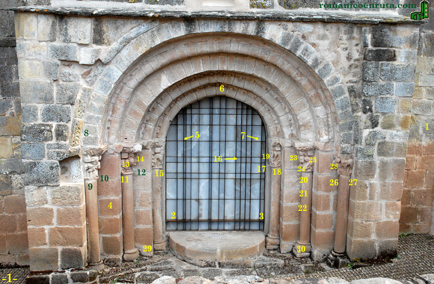 Se compone de cinco arquivoltas de medio punto (enlace 6) y chambrana decorada con motivos vegetales (enlace 8). Las arquivoltas impares apean sobre pares de columnas acodilladas con capiteles de labra no muy excelsa pero interesantes desde el punto de vista iconográfico (enlaces 5/7). En el capitel exterior izquierdo se esculpen dos posibles leones afrontados (enlaces 9/10); la escena del capitel central podría representar, en su lado izquierdo, a Sansón desquijarando al león, pero en el lado derecho asoman dos cabezas más que dificultan la interpretación (enlaces 11 a 14); en el capitel interior, muy deteriorada, un águila expande sus alas (enlace 15). En el lado derecho, empezando por el capitel interior, observamos: un águila con su presa (enlaces 17 a 19, lado izquierdo de la cesta); una lucha, al parecer, entre dos fieras y dos personajes (enlaces 20 a 25); y, finalmente, una escena en la que, en nuestra opinión, un personaje muy mutilado apenas discernible aparece a lomos de un león o fiera intentando dominarla (enlaces 26 a 28). |