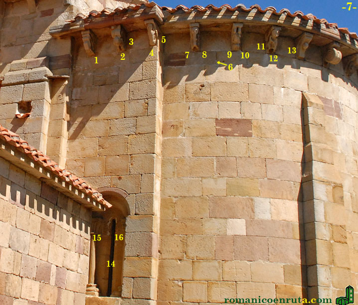 El alero de la cabecera se sostiene por medio de una serie de 22 canecillos, seis en los tramos presbiteriales (tres a cada lado) y 16 en el semicírculo absidal. En la foto inferior os detallamos los del lado sur. Empezando por los tres del tramo presbiterial, observaréis: cuatro cavetos superpuestos (enlace 1); hombre que carga con un tonel (enlaces 2/3) y una liebre (enlaces 4/5). Ya en el tramo semicircular, la serie continúa con los siguientes motivos: personaje que toca la flauta (enlaces 7/8); una mujer en estado (enlaces 9/10); un rabelista (enlaces 11/12) y una bola con caperuza sobre caveto (enlace 13).